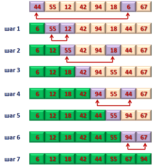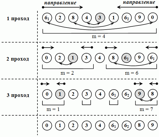 Здесь мы ввели в алгоритм новую переменную m, первоначально присвоив ей значение переменной n (количество элементов массива). По завершению очередного прохода по массиву мы уменьшаем значение переменной m. Это несколько ускорит сортировку массива, так как количество попарных сравнений элементов с каждым проходом будет уменьшаться.84. Сортировка вставкой
