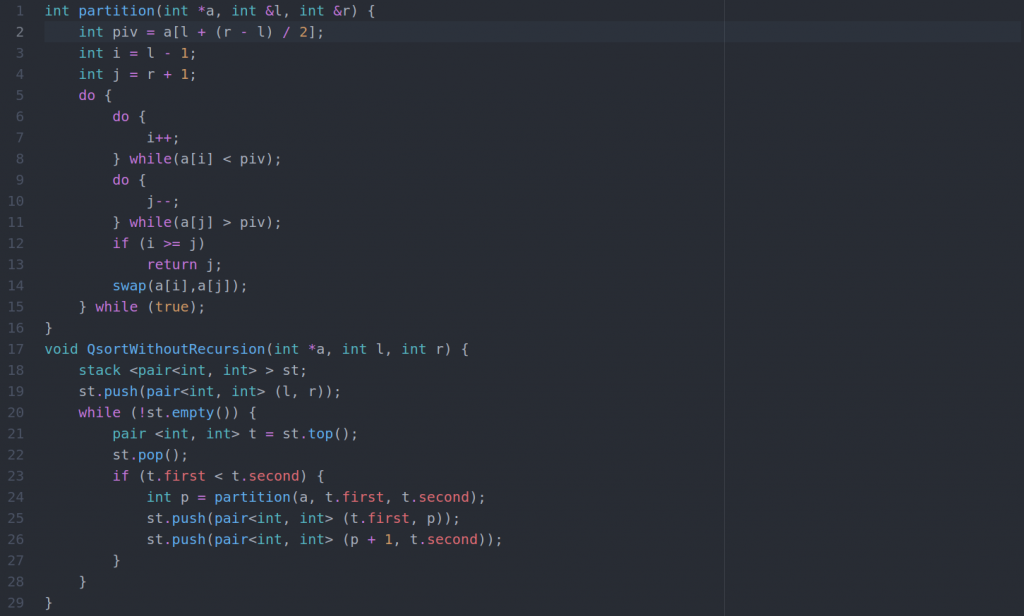Если постараться, быструю сортировку можно написать без рекурсии. Для этого можно использовать структуру данных стек, который реализует принцип LIFO, что соответствует принципу выполнения функции при рекурсии. В стек мы будем складывать пары (l, r). Также при выборе опорного элемента лучше писать int piv = a[l + (r - l) / 2]. Так можно уменьшить вероятность переполнения переменной.